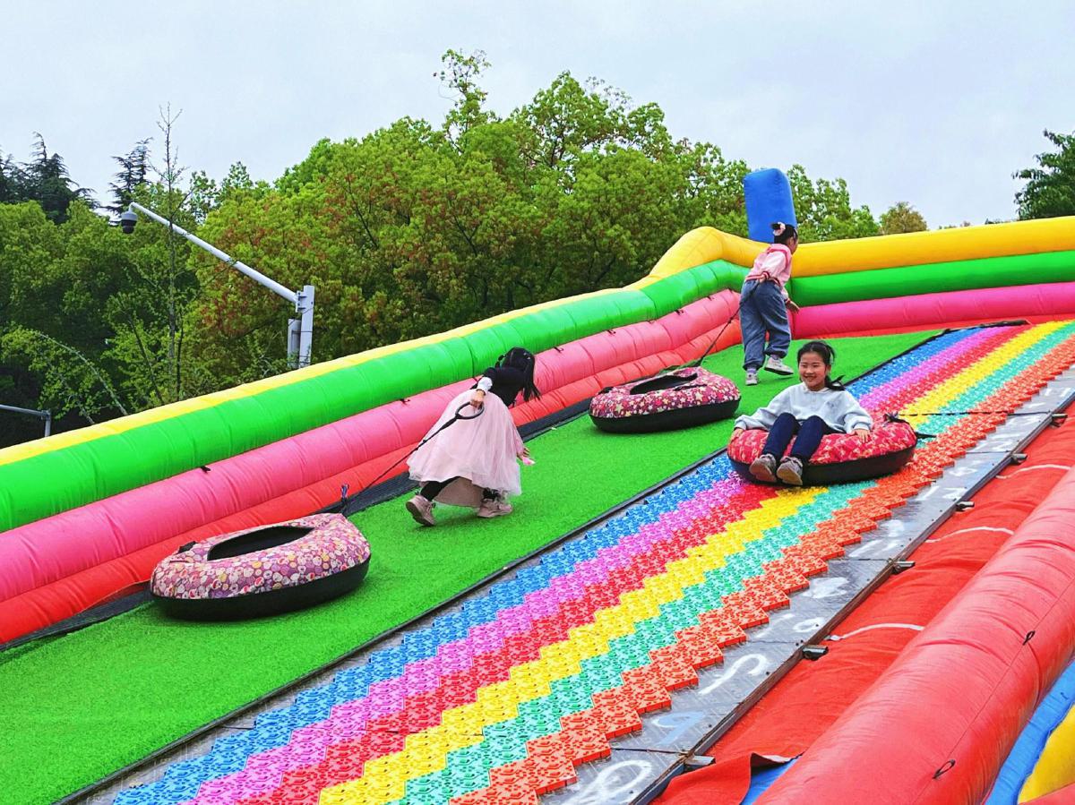孩子们在团城猴子园充气滑梯上玩耍